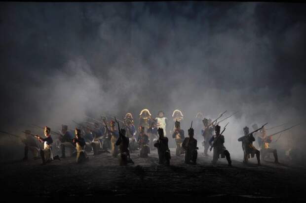 Кинематографический подход к спектаклю сделал его очень зрелищным: словно кадры на экране, друг друга сменяют впечатляющие картины изысканных балов, бытовых и батальных сцен.