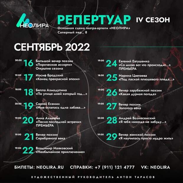 Первое выступление поэтов «Неолиры» на новой площадке состоится 16 сентября: 4-й театральный сезон откроется большим вечером поэзии под названием «Лирическое ассорти». В целом осень обещает быть для поэтов и любителей поэтического творчества очень насыщенной: выступать участники «Неолиры» планируют почти каждый день.
