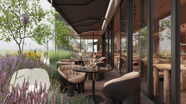 Терраса ресторана – здесь на высоте птичьего полета, природа будто шепчет на древнем языке предков, и каждый звук становится частью гармонии, а перед глазами гостей открывается величественная панорама Кавказских гор. Именно на террасе можно услышать, как птица Дудукуш, легендарная хранительница этих мест, взмахнет крылом где-то в небе.