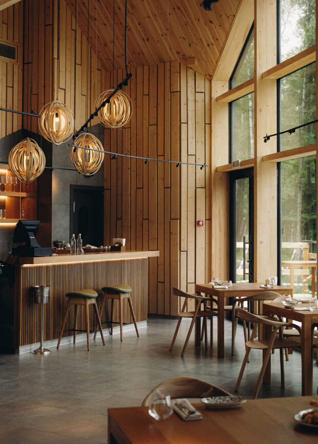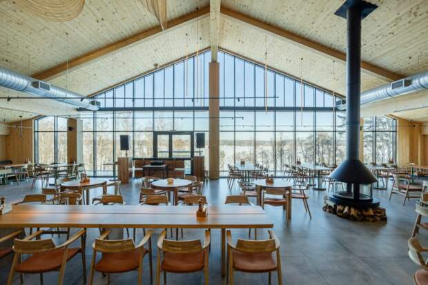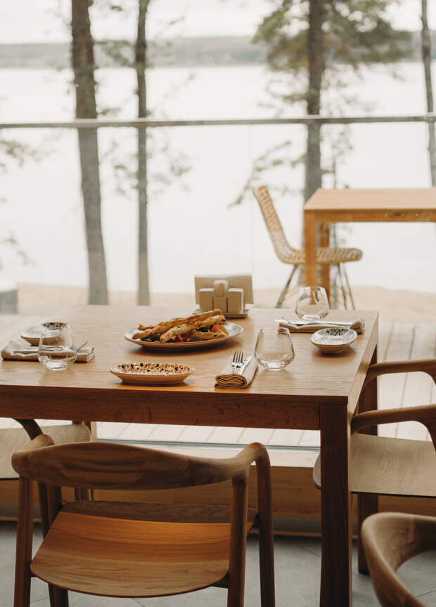 Название переводится с финского как «воздух», и это не метафора. Ресторан построен прямо на возвышении над озером: терраса органично вписана в пространство, панорамные окна отражают воду, а за спиной — смешанный лес и папоротниковые поляны.