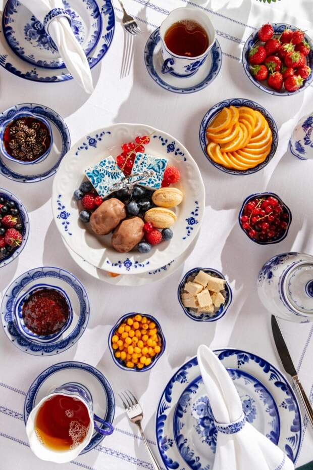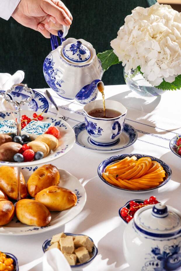 Авторская фарфоровая посуда была создана специально для проекта: чайные пары в сказочном сине-белом узоре, этажерка для многоярусной сервировки. В контексте чаепития каждый элемент легендарного бренда «Гжель» становится больше, чем просто деталью – живой историей, к которой хочется прикоснуться, попробовать и остаться в моменте как можно дольше.