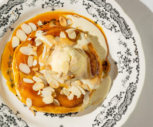 За сладкий сюрприз отвечает тарт татен с сезонными абрикосами, пломбиром и миндалём. Если казалось, что лучше яблочного из основного меню быть не может — может!