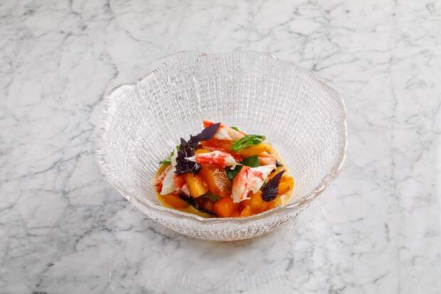 Среди хитов — камчатский краб с хурмой и желтыми томатами. Мясо краба, нежное и сладковатое, удачно сочетается с маринованными томатами и соусом на березовом соке с красным базиликом: текстуры играют, вкусы взрываются свежестью — это чистый восторг, напоминающий о сибирских просторах в сердце Петербурга.