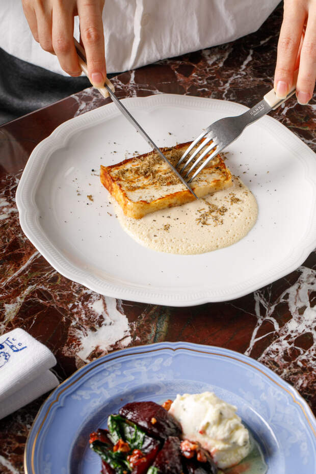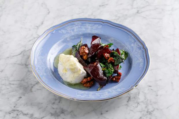 Но не все столь безупречно. Запеченная свекла с ванильным медом, шалфеем и грецким орехом в сырном креме разочаровала: глазури не хватило сладости, зелень завяла, а свекла утонула в собственном соку — простовато, без той искры, что обещает концепция.