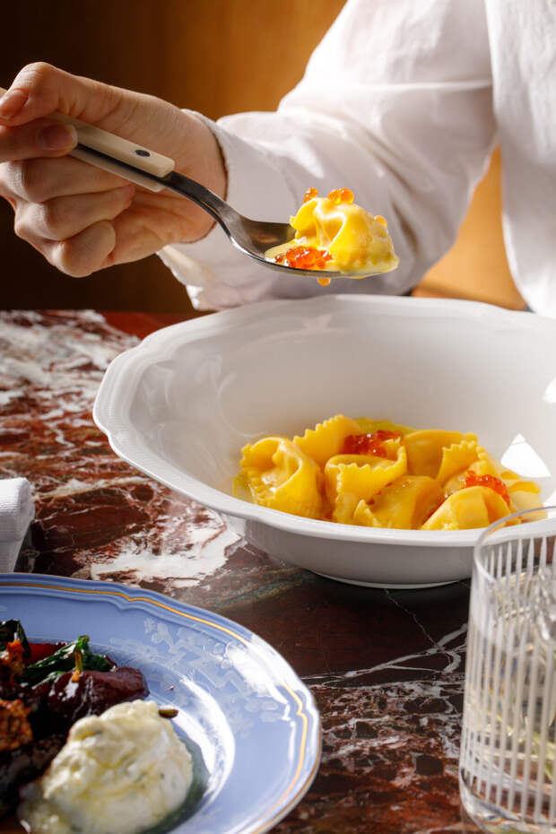 Еще ярче пельмени с крабом и гребешком в бархатистом тыквенном велюте со сливками и красной икрой: нежная начинка тает во рту, соус обволакивает как зимний плед, — пожалуй, самое удачное новшество, которое хочется заказывать снова.