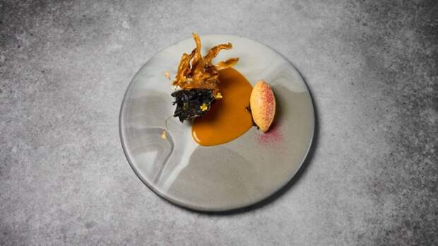 А фалангу камчатского краба, обжаренную на смеси кокосового и чесночного масла, здесь сопровождают кислая полба, мочёная брусника и чипсы из водорослей.