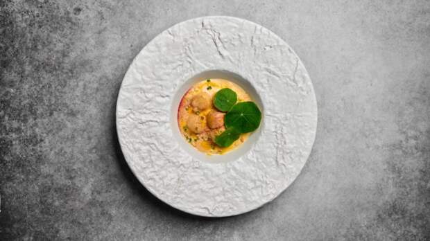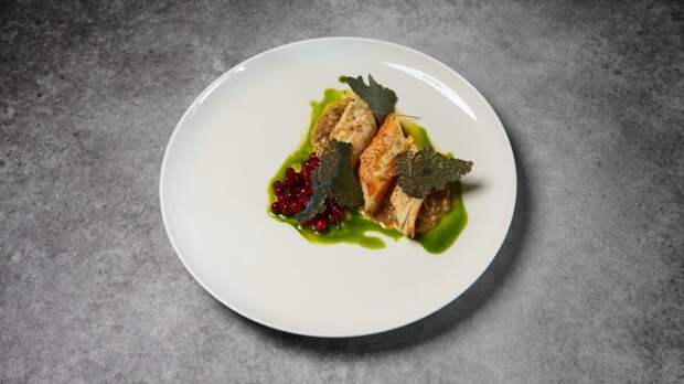 Горячую закуску из нежного морского гребешка, обжаренного на масле нуазетт (2290 р.), шеф дополняет толокном, пюре из кукурузы и соусом из печёной тыквы. Яркие вкусовые и текстурные акценты в блюде расставляют кедровые орешки, стебли щавеля, пудра из сушёной брусники и листья настурции.