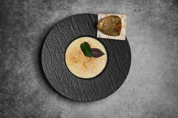Второе сырное блюдо – густой сливочный крем-суп из пошехонского сыра с филе домашнего цыпленка, маринованным в травах (1100 р.). При подаче к супу добавляют тёртый фундук и листья удивительного съедобного растения, которое носит название «сырный лист» или «лист камамбера» и обладает отчётливым вкусом и ароматом сыра с белой плесенью.