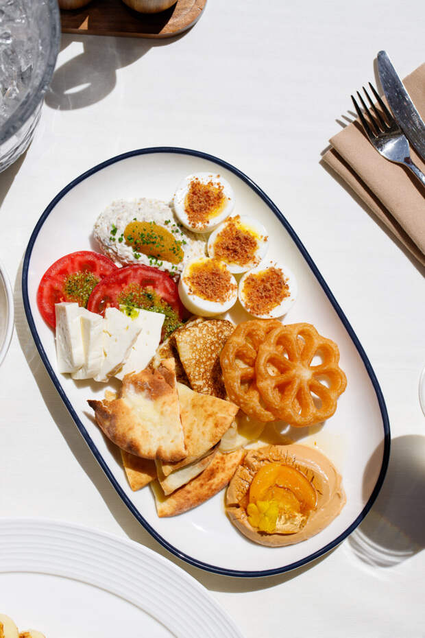 Даже классические утренние сюжеты здесь на свой манер. Яичница по-южному – с фирменным брискетом, таганрогскими томатами и сулугуни. Блинный пирог – с мясом и соусом из сулугуни и пармезана. Омлет – с крымскими креветками или с ростовскими раками. И сырники – из творога, топленого в печи.
