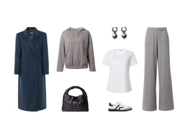 Основа образа – элегантное двубортное пальто прямого силуэта в глубоком тёмно-синем цвете. Его интересная ворсовая ткань синего оттенка с тонкой молочной полоской и расширенная линия плеча придают классике современное звучание. В сочетании с уютным трикотажным костюмом и кедами, этот наряд идеально подходит для долгих осенних прогулок. Серебряные серьги добавят утончённости.