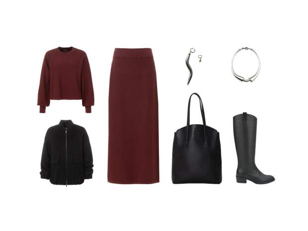 Этой осенью терракотовый — ваш must-have! Джемпер и макси-юбка из вискозного трикотажа создают комфортную, но в то же время элегантную базу. Завершите look модным бомбером и чёрными казаками, а минималистичные серебристые украшения добавят ему завершённости и лёгкого блеска.