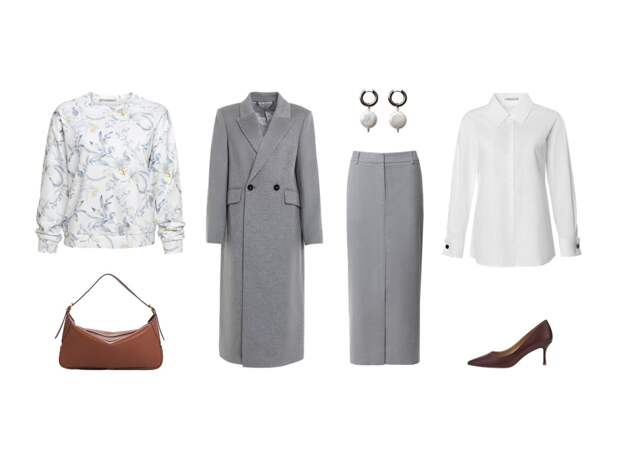 Этой осенью многослойность — наш главный стилистический прием! Сочетаем серое меланжевое пальто с юбкой-карандаш, рубашкой и джемпером с деликатным цветочным принтом. Монохромную базу разбавляем акцентными аксессуарами и обувью, которые сделают ваш образ по-настоящему запоминающимся.