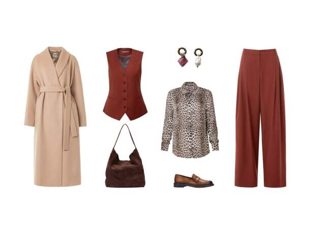 Гармония осенних оттенков: терракотовый костюм служит идеальной основой для леопардовой блузы и пальто в нежном бежевом цвете.
