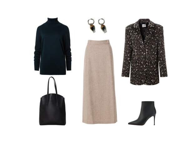 Образ построен вокруг полупальто с притягательным леопардовым принтом. Уравновесьте его смелость классическими оттенками: бежевая юбка миди и тёмно-зелёная водолазка из вискозы и хлопка создают идеальную базу. Дополните образ для делового бранча ботильонами на шпильке, функциональным шоппером для документов и нежными серьгами-бутонами.