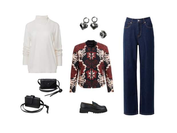 Мягкая молочная водолазка и свободные тёмно-синие джинсы создают идеальную базу, а главный акцент – жакет на молнии с завораживающим этническим принтом и лазерной стежкой. Наденьте комфортные лоферы для лёгкости каждого шага и добавьте игривые серебряные серьги-сердца, чтобы завершить этот стильный ансамбль.