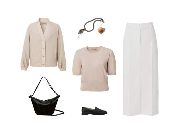 В основе — нежная монохромная палитра: объёмный жакет-бомбер из стёганой ткани создаёт модный цветовой силуэт с уютным джемпером из вискозы и шерсти и прямой юбкой-миди с рельефными стрелками. Завершают образ контрастные детали: удобные лоферы, добавляющие практичности, уточнённые украшения и стильная сумка-кросс-боди.