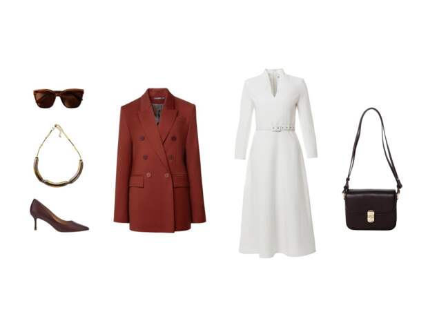 Приталенное платье молочного цвета и классический двубортный жакет оттенка красного дерева – идеальный тандем для деловых встреч, где важна каждая деталь. Добавьте комфортные лодочки, функциональную кросс-боди и элегантное золотое колье, чтобы выглядеть безупречно.