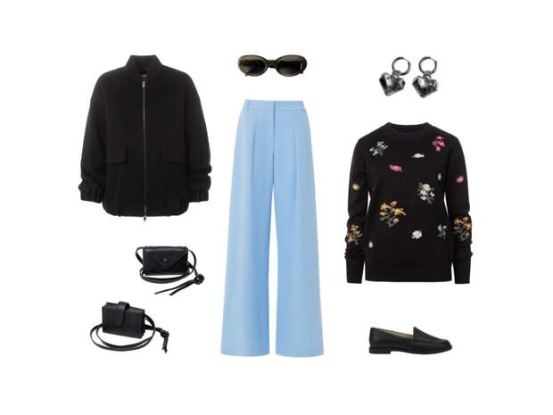 Чёрный цвет оживает благодаря голубым прямым брюкам, которые добавляют динамики и свежести. Добавляем стильные акценты: серебристые серьги в форме сердца, комфортные лоферы и практичные мини-сумки, делающие этот образ идеальным решением для долгих прогулок по городу. и богатой историей, внёсшей значительный вклад в развитие русского театрального искусства.