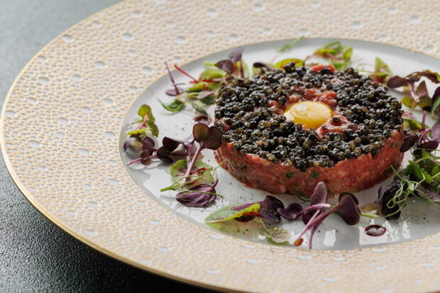 В Инсалата Русса с камчатским крабом и черной икрой Джузеппе берет форму легендарного «оливье» и наполняет ее новым содержанием: нежное мясо камчатского краба, домашний майонез двойного эмульгирования и порция черной икры (3500 руб). Далее – тартар из говядины с черной икрой создан из мраморной говядины с рыбным гарумом, луком шалот и сибулет (4500 руб). Спагетти Butler с черной икрой и золотом в шелковистом соусе из выдержанного коньяка и сливок создают идеальную кремовую основу, оттеняя вкус икры (5500 руб).