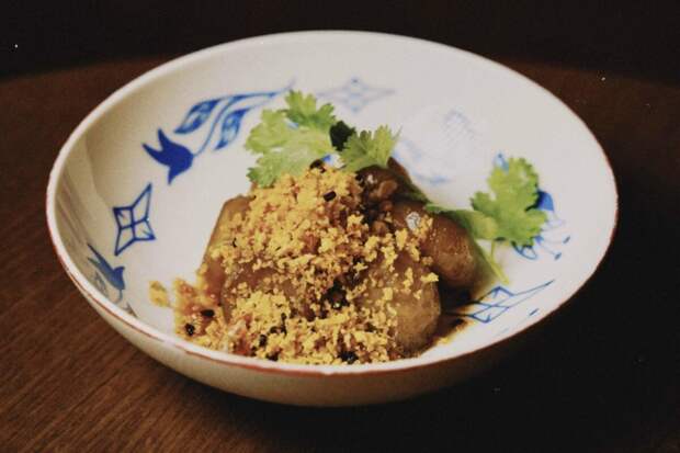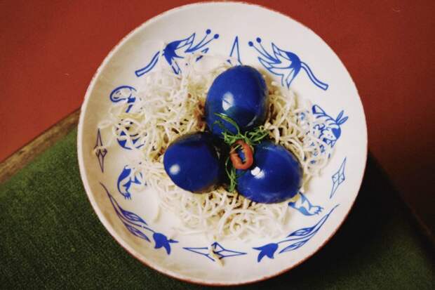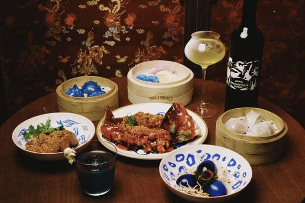 Вместо столетних яиц в WU SHU предлагают синие маринованные яйца (350 р.) в устричном соусе, а подают их в «гнезде» из хрустящей лапши. Следующий курс — водяные каштаны в пряном соусе (450 р.) с чесноком, кунжутным маслом и ферментированными соевыми бобами.