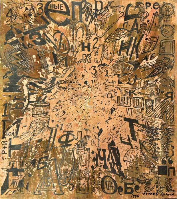 Поэтому ребусы Африки принципиально неразгадываемы до конца. Их нельзя решить как задачу. Их можно только опытно пережить. Вглядываясь в мерцающую поверхность «Ребуса-28», мы видим не шифр, а топографию памяти. Образы-архетипы (глаз, дом, птица) сталкиваются с фрагментами быта (люстра, бант), буквы русского алфавита теряют фонетическую определенность, превращаясь в чисто графические, почти сакральные знаки. Это сновидение наяву, где ценность имеет не «правильный ответ», а интенсивность самого процесса блуждания взгляда по лабиринту смыслов.