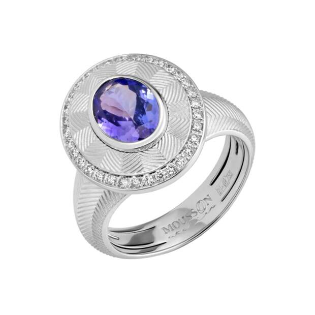 Кольцо с танзанитом и бриллиантами, напоминает старинную технику Фаберже — гильоширование, в более точном визуальном и технологическом исполнении.