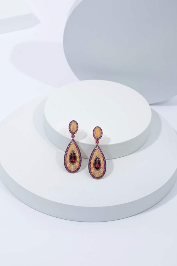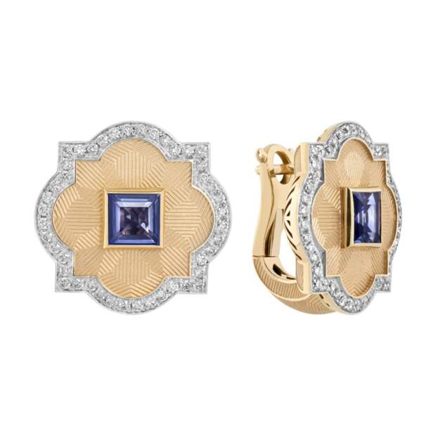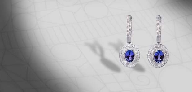 Серьги с танзанитами и бриллиантами, где применено гильоширование — искусство создания различных паттернов на золоте.