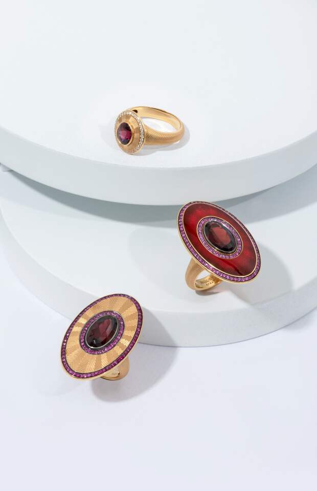 Фактура «твидовой ткани в ёлочку», искусно воплощенная на золоте в комбинации с крупными камнями, цветной эмалью и бриллиантами, создает эффект, который подчеркивает индивидуальность и утонченность своего обладателя.