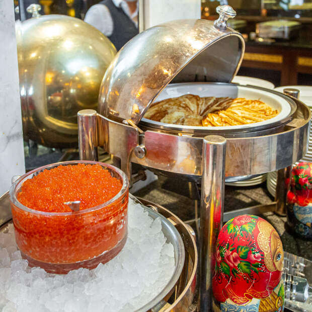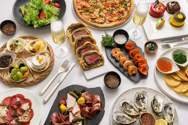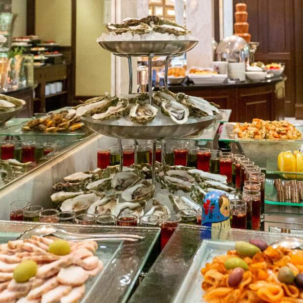 Роскошный «шведский стол» включает более 100 наименований блюд: свежайшие устрицы, маринованные в белом вине мидии, тигровые креветки и другие морепродукты, сашими и роллы из тунца и лосося, тартары из лосося, тунца и говядины, холодные закуски, салаты, мясная нарезка и ассорти сыров, крем-суп из пастернака и царская уха, кулебяка с лососем и премиум рибай с розмарином, утиное филе с клюквенным соусом и филе сибаса на гриле, хиты русской и европейской кухни – блины с красной икрой, грибы и соленья, пирожки, оливье, вареники, домашняя пицца из печи с разными начинками и несколько видов пасты.