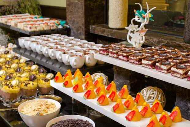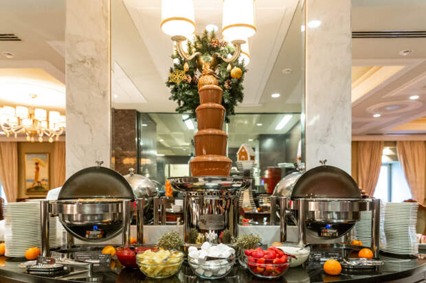 Гостей бранча ждут два десятка холодных и горячих десертов, в том числе, меренговый рулет и рождественское полено, ассорти фруктов, мороженое и сорбет и, конечно, шоколадный фонтан с клубникой, ананасом и маршмеллоу.