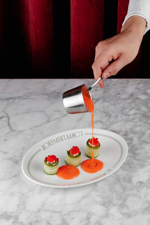 Команда кафе «Документалист» отказалась от идеи представить национальную или концептуальную кухню и собрала в меню блюда-хайлайты российских кафе и ресторанов разных эпох: паштет из куриной печени с ванилью и горячим тартином, страчателла с вяленой уткой и цитрусами, оливье, уха по-фински.