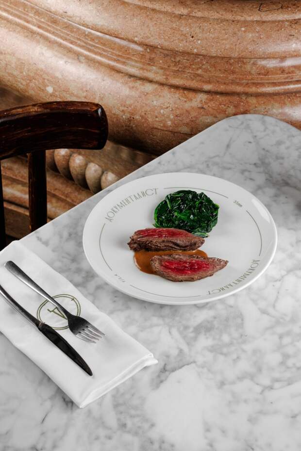 Среди основных блюд — пельмени из щечек с лесным бульоном, утиная ножка конфи с морковным кремом, стейк бавет с перечным соусом и шпинатом. Десертная карта включает чизкейк-брюле, лимонную бабу с цитрусами и соусом лимончелло, базиликовую панна-котту с малиной. Коктейльную карту разработал Глеб Гандрабура: в её основе — легендарные напитки советских фешенебельных баров при гостиницах, переосмысленные в современных авторских твистах.Идею интерьерной концепции разработала ресторатор и дизайнер Ольга Волдайкина, подчеркнув исторический контекст и многослойность пространства. Работа с винтажной мебелью и историческими аллюзиями — фирменный почерк дизайнера.