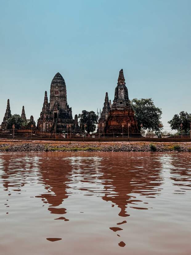 А на берегу реки возвышается Ват Чайваттханарам — один из самых фотогеничных храмов Таиланда, особенно в золотой час, когда кирпичи вспыхивают тёплым медным светом.