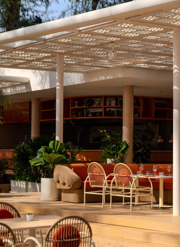 Белоснежные перголы, увитые бугенвиллией, создадут тенистые уголки для потягивания коктейлей и неспешных бесед, а на зеленой лужайке, окружающей зону бассейна, гостей ждут шезлонги цвета корицы, куда прямиком доставят фирменные блюда и коктейли.