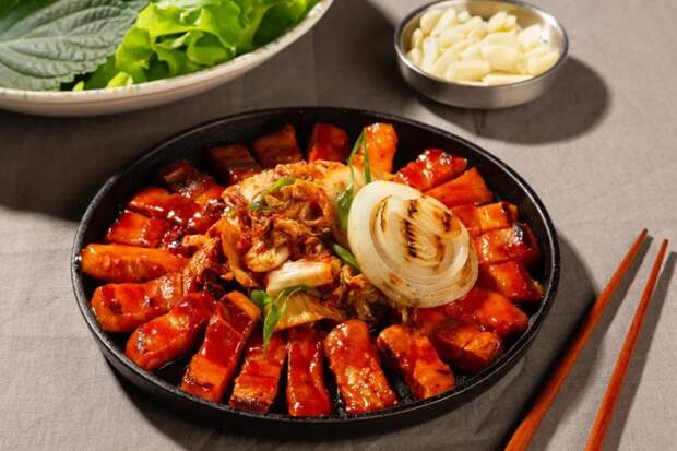 Теди BBQ — свиная шея, обжаренная на гриле в соусе пульгоги. Подается со свежими салатными листьями, белым луком гриль и жареным кимчи.