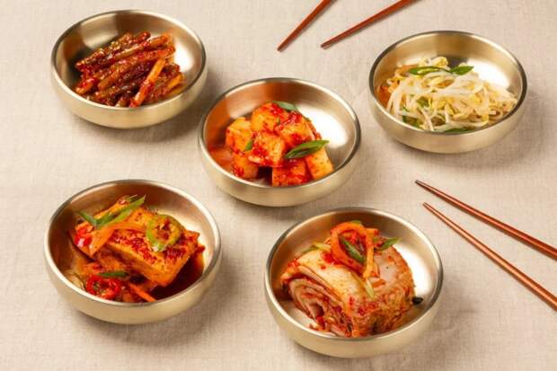 Новый панчан-сет: пять традиционных южнокорейских закусок, разжигающих аппетит. Сукчу намуль — ростки маша в заправке из кунжута, моныль чон — остро-сладкая черемша, фреш кимчи, обжаренный тофу с зеленым луком и белая маринованная редька кактуги.