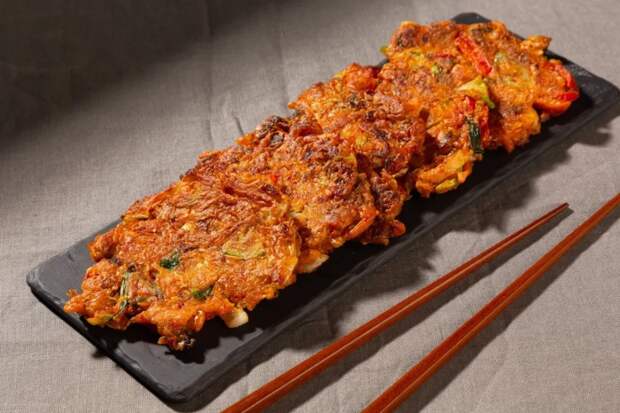 Блинчики паджон из рисового теста с кимчи, морковью, кабачками и шампиньонами.