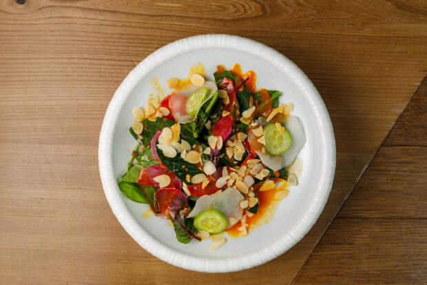 - Зелёный салат со сладкими помидорами шпинатом, арбузной редькой, миндалём и облепиховой заправкой — 780 руб.