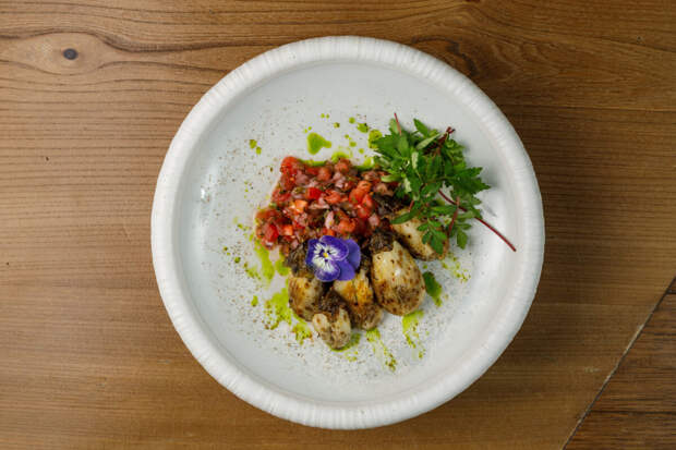 - Запечённые мини-баклажаны с томатной сальсой и зелёным маслом — 1480 руб.