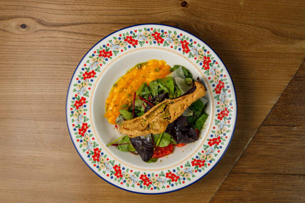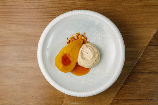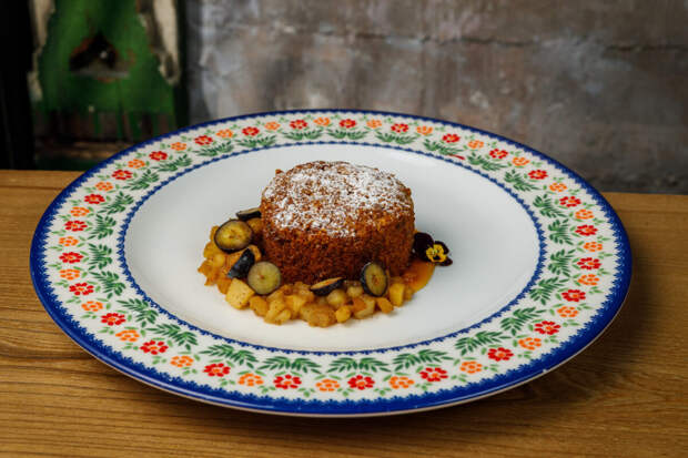 А на десерт Татьяна Костицына испекла морковный кекс с яблоком и голубикой зы 460 руб. и затомила грушу с шафраном и подала ее с арахисовым муссом и гранолой с апельсиновым соусом -780 руб.