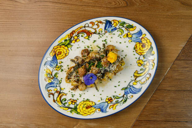 - Запечённый в соли картофель с белыми грибами, вешенками и молодой черемшой — 980 руб.