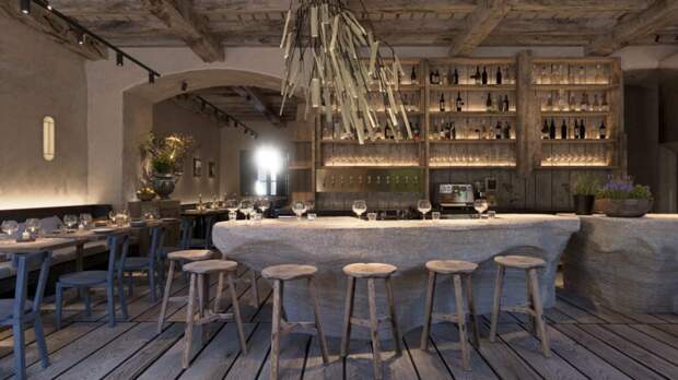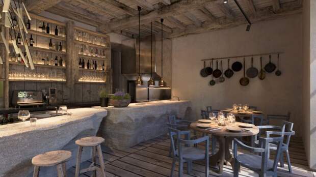 Интерьер Pomme Verte вдохновлён стилем деревенской Франции: состаренные деревянные потолки, полы из цельного дерева, каменные «острова», напоминающие скалы Нормандии. Центральным акцентом стал винтажный сидровой пресс, привезённый со старой фермы во Франции.
