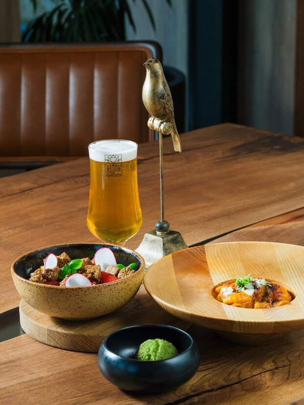 К пиву в меню выдают варианты для пэйринг, а для комфортного ориентирования гостя сделаны пометки: «на огне», «острое», «местное» и «собственное» производство. Бренд-шеф курорта Андрей Савенков и шеф-повар Владимир Куликов подбирали блюда на основе глубокого изучения кулинарных традиций местных народов, проживающих на этой земле с XVIII века и акцентов на локальные ингредиенты.