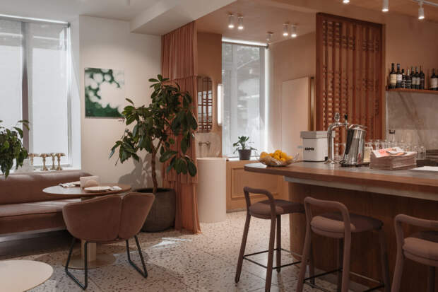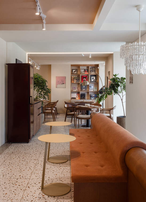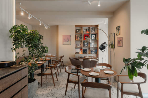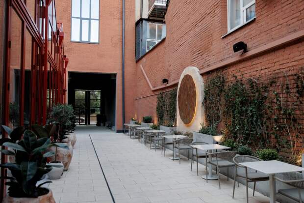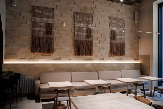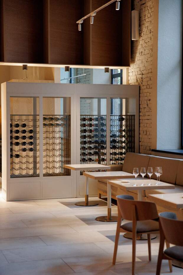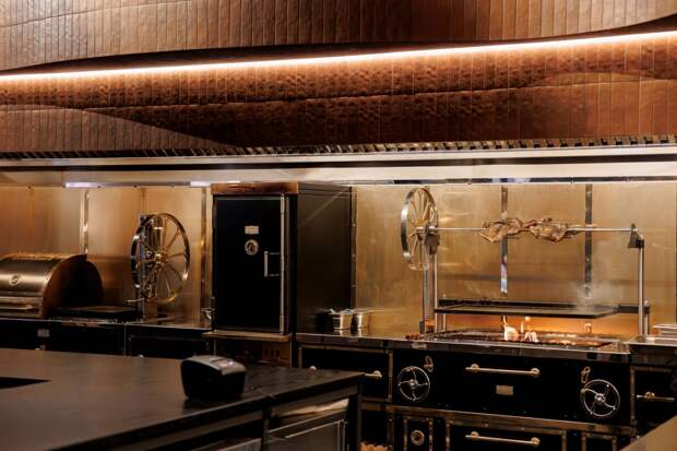В угольной готовят мясо, в дровяной – лепешки, подовая отведена для хлеба по рецептам Алексея Щербака (The Хлеб). Кроме этой зоны в помещении предусмотрены еще несколько: светлый зал с открытой кухней, панорамный зимний сад, внутренний двор, масштабный зал с винотекой и комнатами для винных мероприятий и входная группа с массивным коммунальным столом. Всего ресторан может вместить 290 гостей.