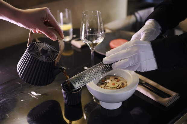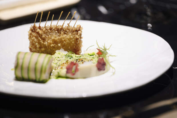 На фарфоре, представленном в королевских домах Европы, подают холодные блюда, характерные для японской классики: позиции raw-бара, сашими и роллы, и горячие – уже с отсылкой к молекулярной кухне французов.