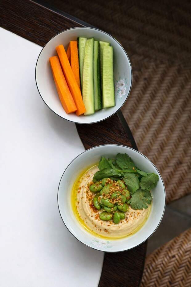 - Хумус с эдамаме и овощными палочками, 690 р.