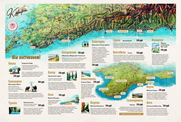 Теперь меню “Курортов” выглядит как газета “Курортная правда”, на развороте которой располагается карта Черноморского побережья – цветная, как из советских школьных атласов – с обозначением самых знаменитых городов, где мечтал отдохнуть каждый советский житель.
