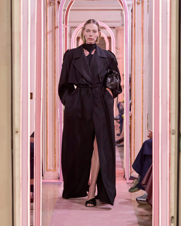 Блузоны и пальто-пиджаки из атласа, с текстурой, напоминающей страусиную кожу. Объёмный тренч открывает новую главу в верхней одежде: внушительный, обволакивающий, сексуальный, способный сочетать функциональность с соблазнением.