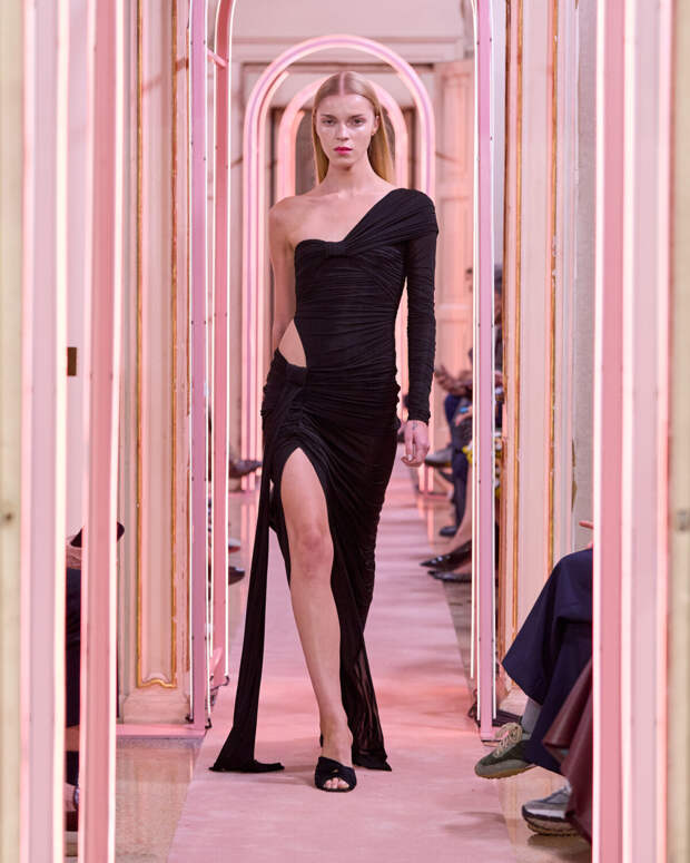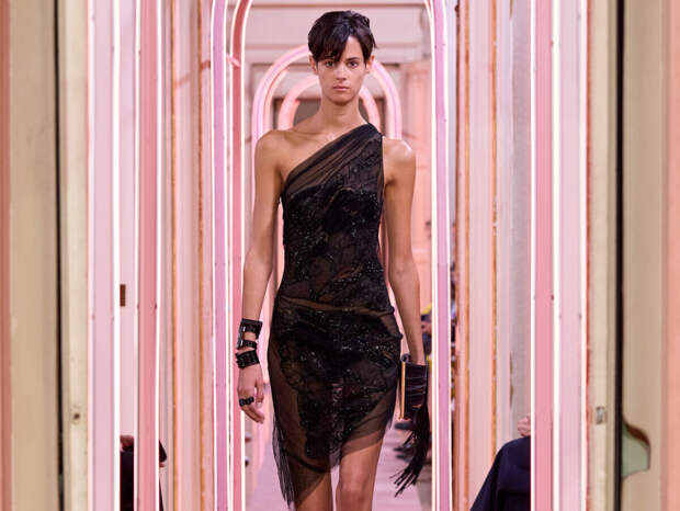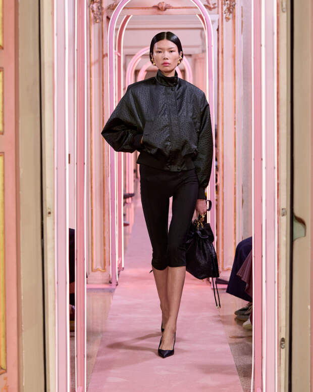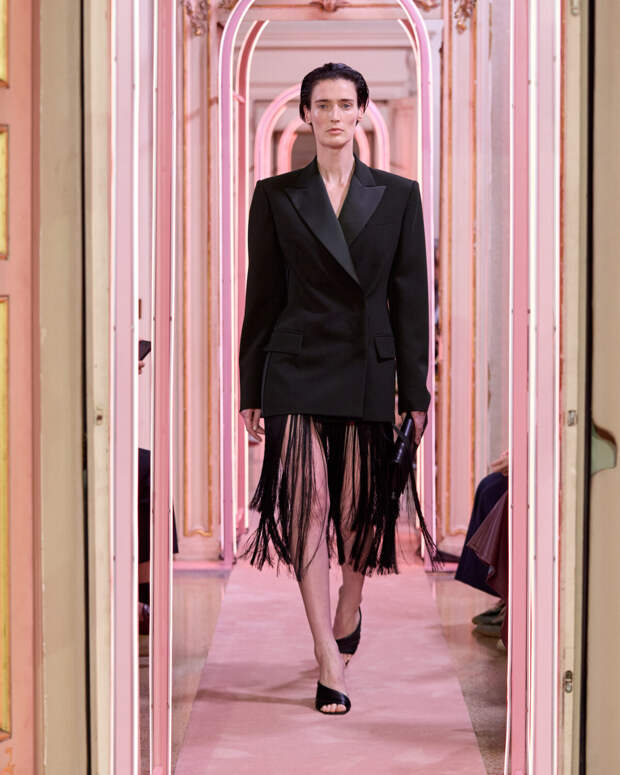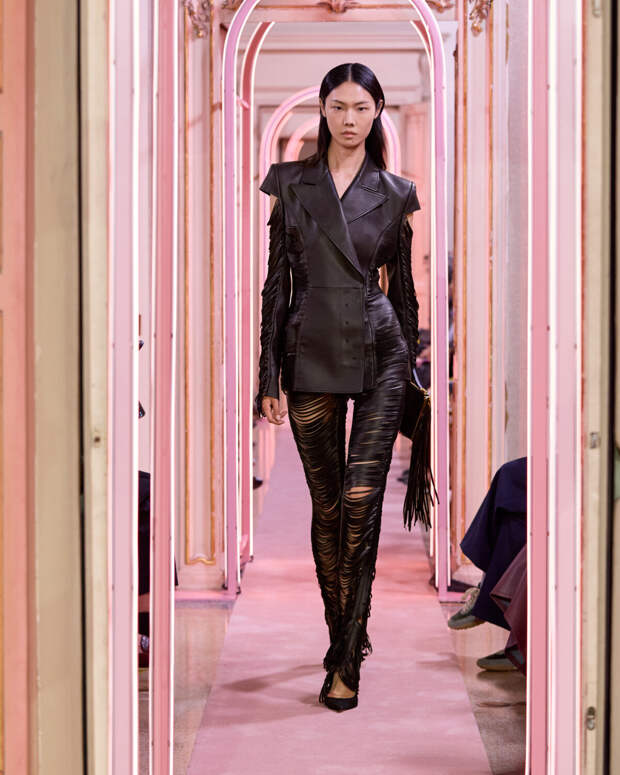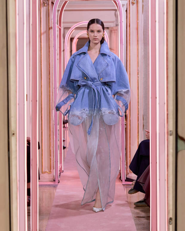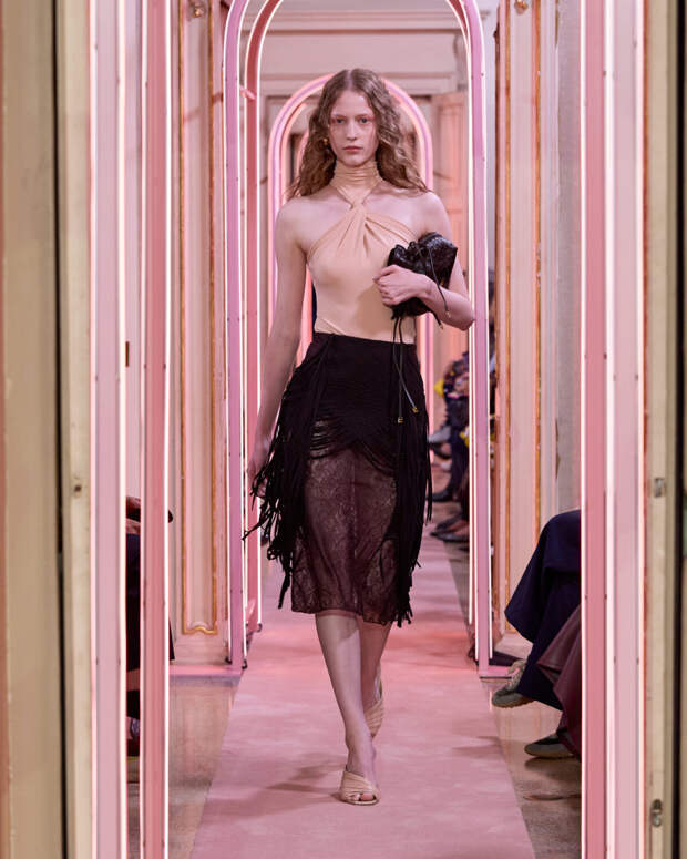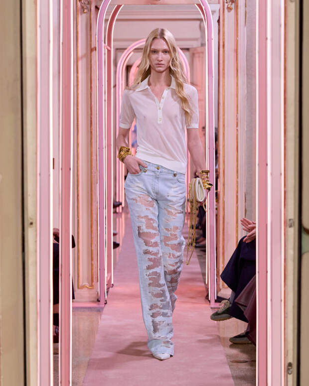 Деним с потертостями и бахромой — знак городской, беспечной, освобожденной экспрессии. Палитра цветов играет на смелых контрастах: чёрный, сливочное масло, нюд и розовый сменяются тёплыми оттенками какао и глины, подтверждая фирменные тона Дома.