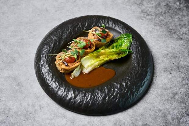 В зелёные блинчики с морской капустой он заворачивает начинку из подкопчённой белуги, солёных белых груздей, маринованного лука и домашнего соуса, а украшает их хрустальной травой и цветами алиссума.